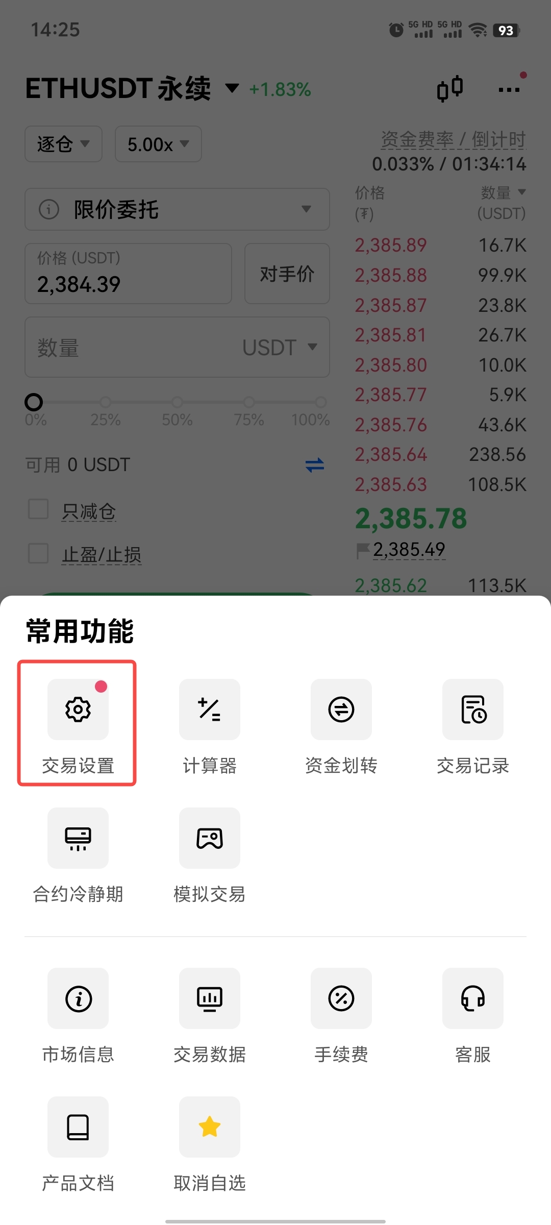 OKX Exchange에서 "거래 설정"을 엽니다.